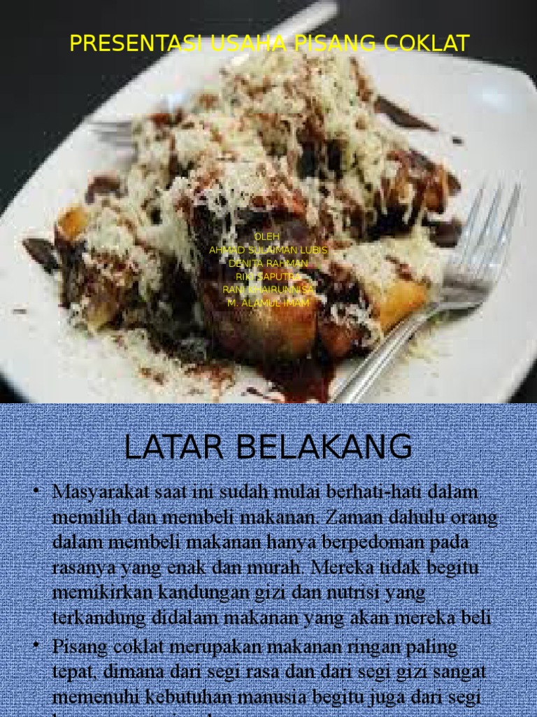 Disusun oleh dalam laporan ini kami akan membahas mengenai membuat makanan pisang cryspi isi coklat proposal usaha makanan. Contoh proposal usaha makanan kurang lebih sama dengan proposal usaha di bidang lainnya.